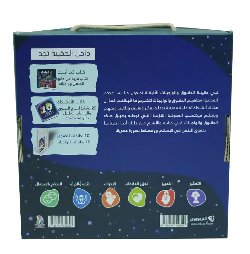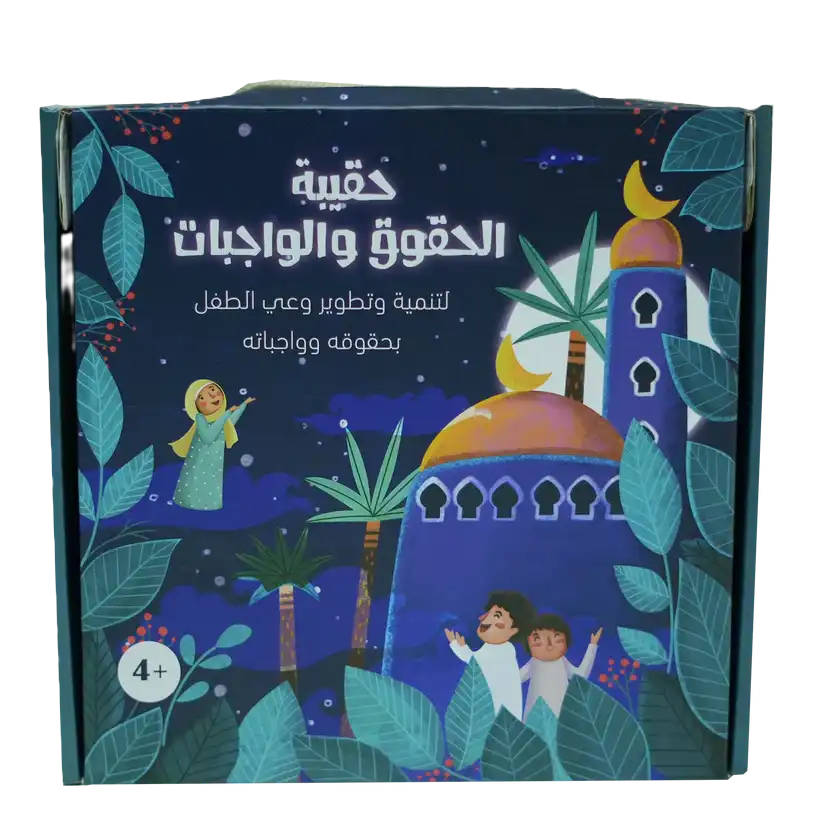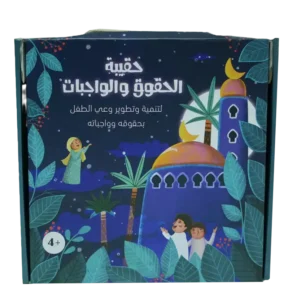 تجد داخل الحقيبة: 1. كتاب كم أحبك: كتاب فريد عن حقوق الطفل وواجباته. 2. كتاب الأنشطة: 20 نشاط لشرح الحقوق والواجبات للطفل بطريقة ممتعة. 3. 10 بطاقات للحقوق. 4. 10 بطاقات للواجبات.