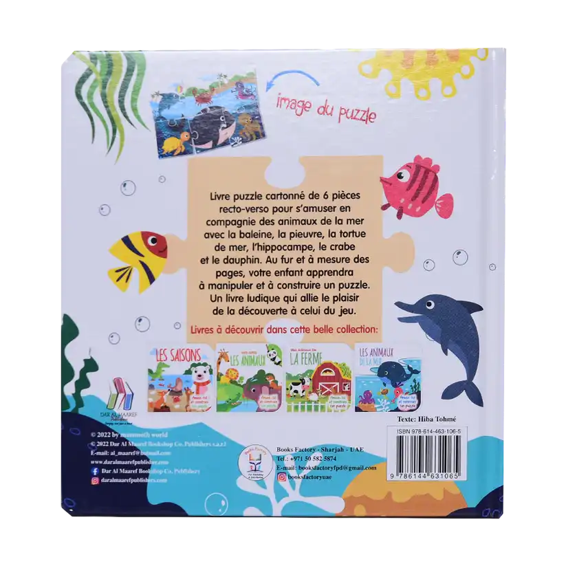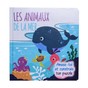 Livre puzzle cartonné de 6 pièces recto-verso pour s’amuser en compagnie des animaux de la mer avec la baleine, la pieuvre, la tortue de mer, l’hippocampe, le crabe et le dauphin. Au fur et à mesure des pages, votre enfant apprendra à manipuler et à construire un puzzle. Un livre ludique qui allie le plaisir de la découverte à celui du jeu.